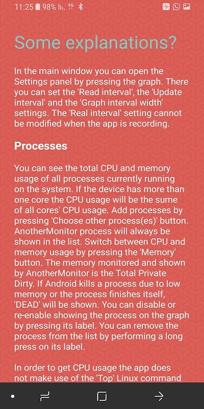 When Android CPU is running on the background it consumes little resources. Then it can monitor and record the CPU and memory usage of other applications on the foreground.