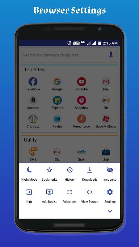 The browser also has the features of night mode, bookmarks, shows history, show downloads, incognito mode, exit button, add a bookmark, fullscreen the app, view source code of any site and setting etc.