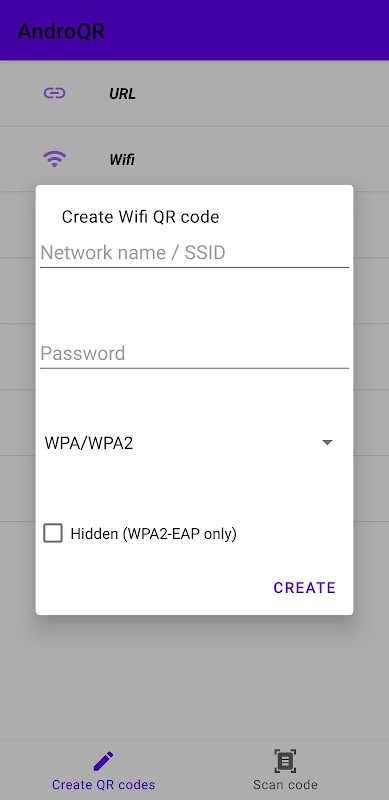 - Create your own QR codes like Url, Wifi configuration, E-Mail, SMS, Coordinates, Text and Phone number