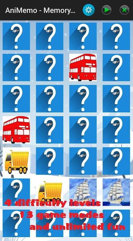 4 سطح (بچے ، نوعمر ، بالغ اور بزرگ) اور 13 طریقوں (جانوروں ، آبی ، پرندوں ، کیڑے ، پھولوں ، پھلوں ، سبزیوں ، شکلیں ، ویکچلز ، گھریلو اشیا ، ملک کے جھنڈے ، آٹوموبائل لوگوز اور کھیل) ہر عمر کے لئے موزوں ہیں .