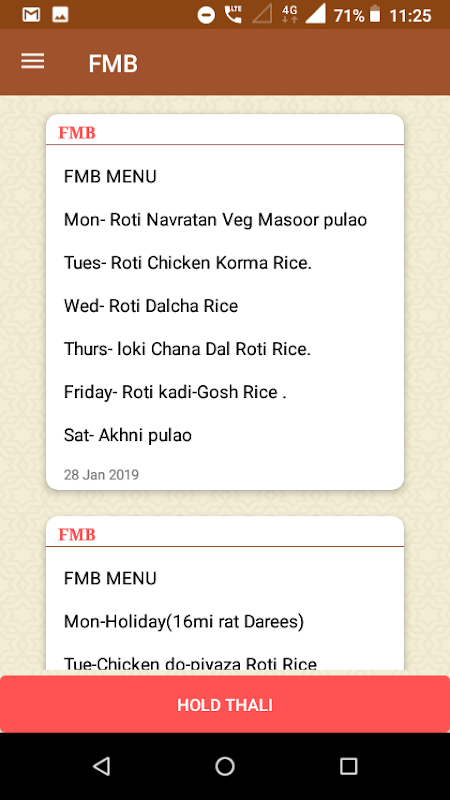 - ایف ایم بی ہولڈ تھالی (اگر آپ باہر جا رہے ہیں اور تھالی نہیں کھا رہے ہیں، تو آئیے آپ ایف ایم بی ٹیم کو مطلع کریں جو کھانے کے ضیاع کو کنٹرول کرنے میں ان کی مدد کرے گی۔)
