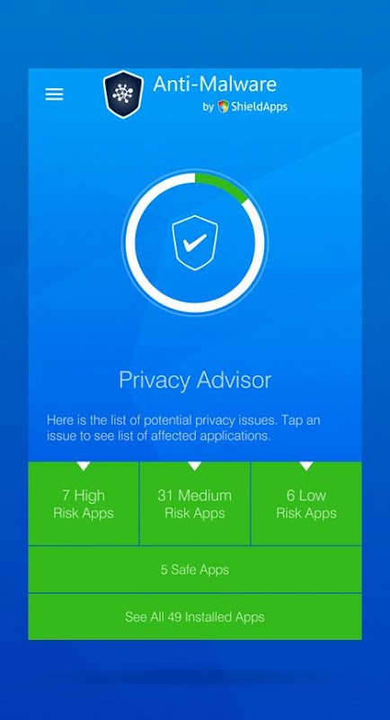 شیلڈ ایپز کا موبائل اینٹی مالویئر ایک فعال تحفظ ایپ ہے جو آپ کے Android ڈیوائس کو میلویئر سے محفوظ رکھتی ہے۔ موبائل اینٹی میلویئر ایپ ایک ساتھ مل کر متعدد انجنوں کو ملازمت دیتی ہے تاکہ ممکنہ حد تک وسیع تحفظ فراہم کیا جاسکے۔