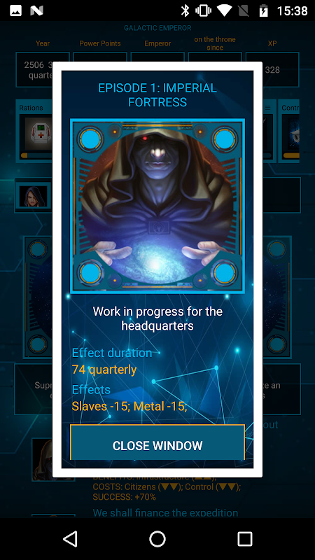 سپریم لیڈر، آج ہم کہکشاں کے شہنشاہ کے طور پر آپ کے خود اعلان کا جشن مناتے ہیں، پرانی جمہوریہ گر گئی ہے! بدقسمتی سے، اس خبر نے آپ کے عالمی تسلط کو روکنے کے لیے کہکشاں خلا میں ہر جگہ بغاوتیں برپا کر دی ہیں۔