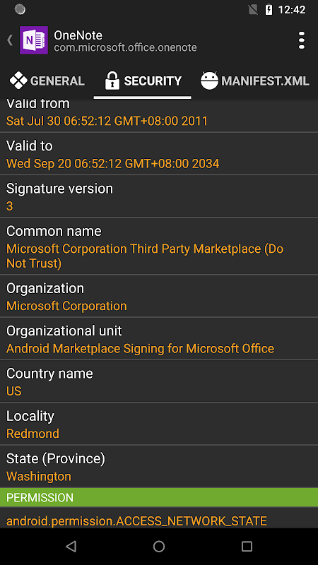 APK Signature Info (SHA1 signature, Datetime, Common name, Organization, Country name, State)