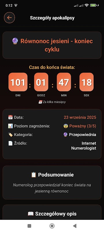 - Detailed descriptions - learn more about each prediction (Mayans, Nostradamus, modern theories)