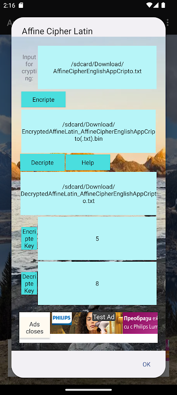 ایپلی کیشن انکرپشن اور ڈکرپشن کے لیے درج ذیل طریقے فراہم کرتی ہے: لاطینی متن کے لیے affine cryptosystem (26 حروف)، affine cryptosystem for Cyrillic text (30 حروف)، RSA cryptosystem اور ASЕ cryptosystem۔