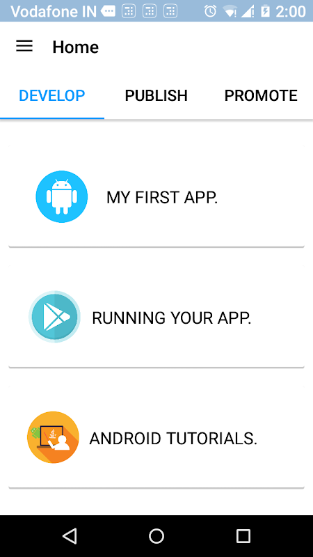 1. Develop: This is further divided into 3 categories from how to make your first app to best tutorials which are available for developer.