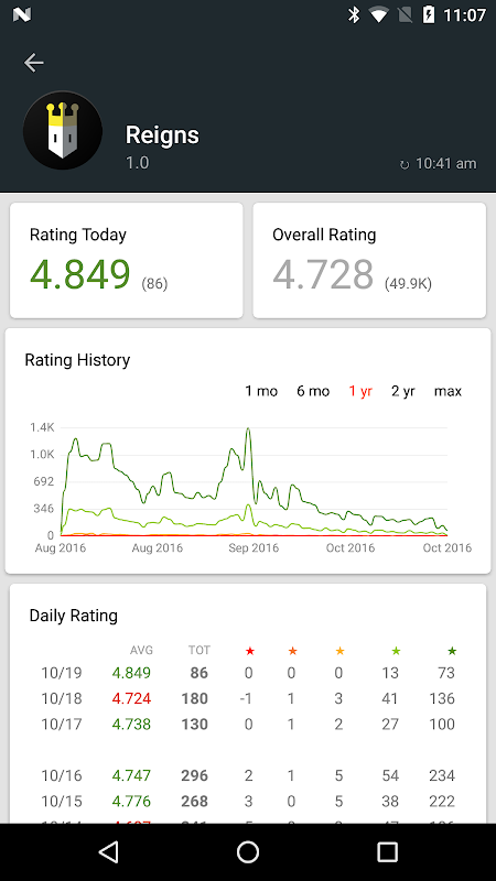 You don't even have to check in to keep up. App Stats will notify you of major app events including version updates, price changes, ratings spikes / drops, major rank changes, and achieving Play Store badges like Top Developer and Editor's Choice.