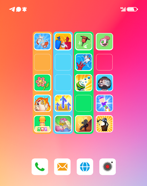 اس گیم میں آپ ایپس کی پوزیشن کو تبدیل کریں گے جیسا کہ آپ عام طور پر اپنے فون پر کرتے ہیں تاکہ انہیں صحیح زون میں سیٹ کیا جا سکے۔ بات زون کے رنگ اور شبیہیں کے پس منظر میں ہے۔ انہیں میچ بنائیں اور سطحوں کو صاف کریں۔