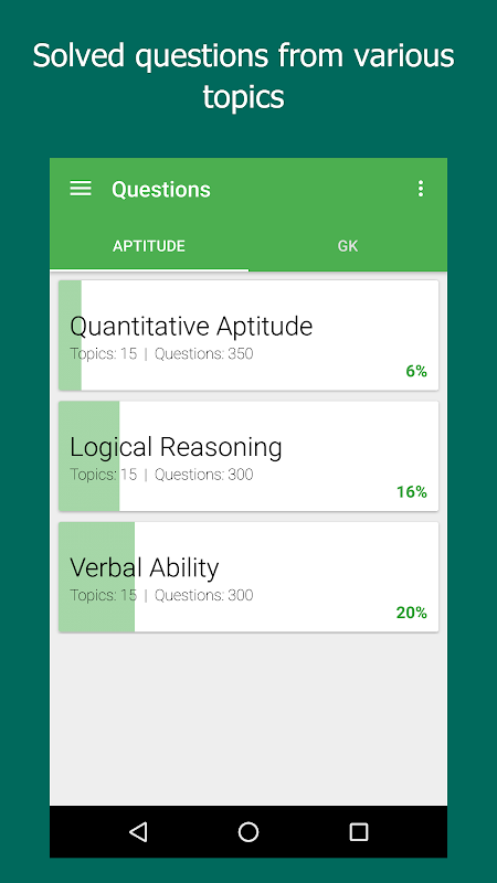 یہ مفت اور آف لائن ایپ آپ کی اہلیت اور استدلال کی مہارت کو بڑھانے اور آپ کے عمومی معلومات کو بہتر بنانے میں معاون ثابت ہوگی۔ کسی بھی معروف کمپنیوں اور بینک امتحانات میں جگہ لینے کے ل A اہلیت کا مسئلہ حل کرنے کی مہارت واحد اہم ترین عنصر ہے۔ ایپ کو خصوصی طور پر ڈیزائن کیا گیا ہے تاکہ ہر سوال کو حل کرنے کے لئے وقت کی نگرانی کی جاسکے اور مسابقتی امتحانات میں اپنی کارکردگی کو بہتر بنا کر: