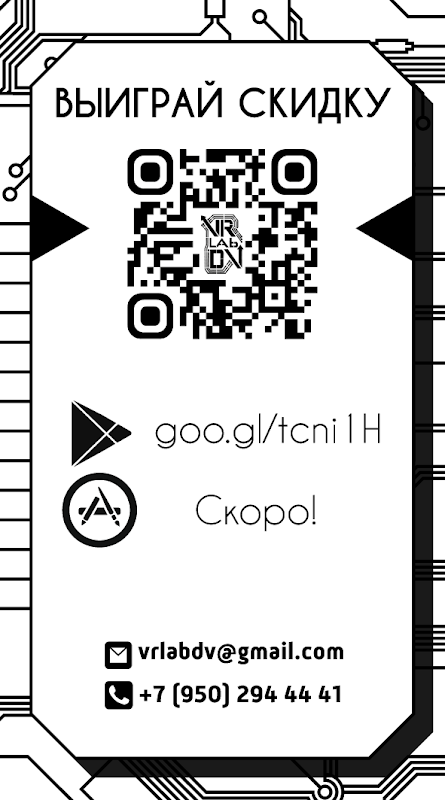 Заимев нашу визитную карточку версии 2.0 у нас в Лаборатории, или где либо, вы сможете воспользоваться данным приложением чтобы пройти задание и получить приз на посещение Лаборатории Виртуальной Реальности Дальний Восток.