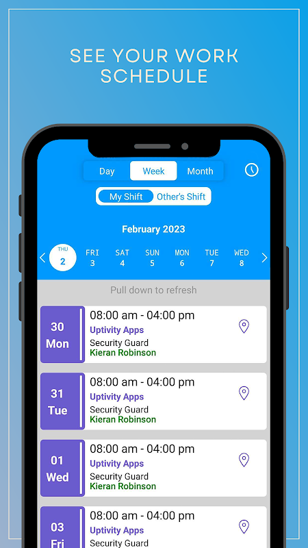 GPS لوکیشن کا استعمال کرتے ہوئے کلاکنگ ان کے لیے ایک ایپ۔ شفٹ کی تفصیلات دیکھنے، چھٹی کی درخواست کرنے اور غیر حاضری کی اطلاع دینے کے لیے بھی استعمال کیا جاتا ہے۔