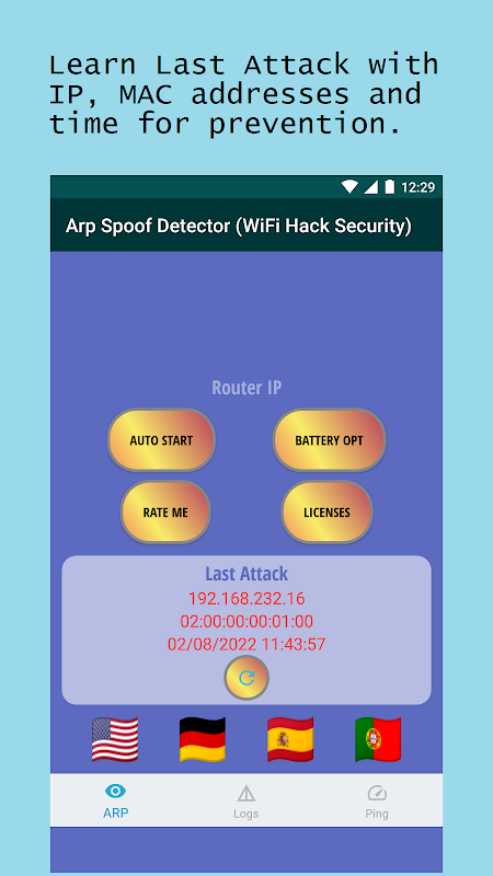 انگریزی، جرمن، ہسپانوی، اور پرتگالی زبانیں سبھی ARP Spoof Detector کے ذریعے تعاون یافتہ ہیں۔