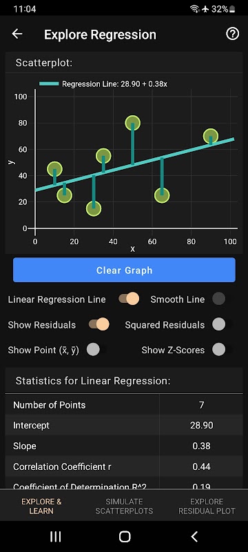 ارتباط/ لکیری رجعت کو دریافت کریں: اسکرین پر ٹیب لگا کر سکیٹر پلاٹ میں پوائنٹس بنائیں (اور حذف کریں)۔ ریگریشن لائن یا باقیات دکھائیں۔ سکیٹر پلاٹس کی تقلید کریں اور ارتباط کے گتانک کا اندازہ لگائیں۔