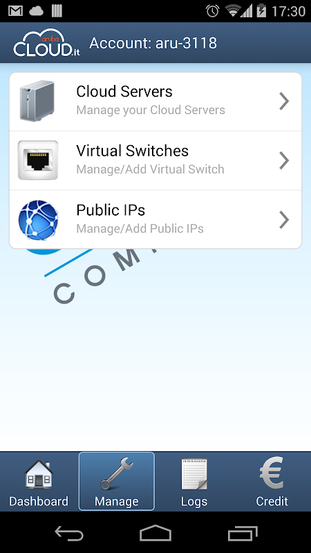 The application allows you to view the features of the virtual Data Centers, perform operations on the Cloud Servers and top-up your credit directly from your tablet, paying by PayPal or Credit Card.