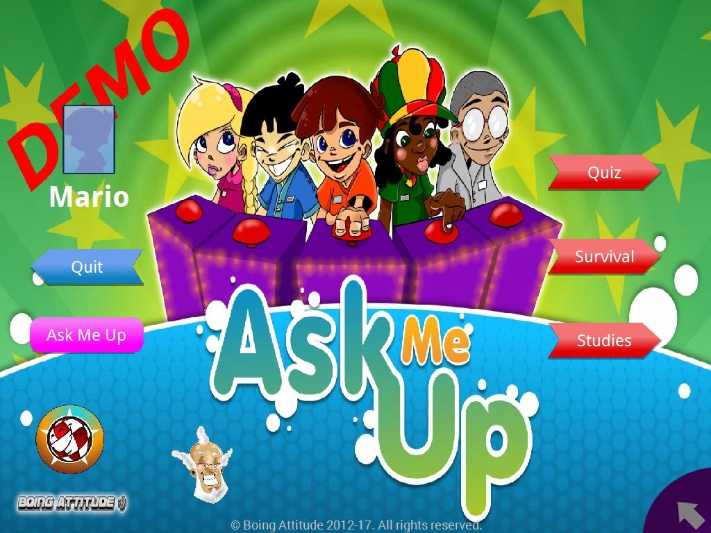 Ask Me Up is a video game about general knowledge. The principle is quite simple: 1 question, 4 possible answers ... Choose the right one! You know all celebrities' secrets? You can easily put a city on a map. You know who is the first white sprinter to have officially run 100m in under 10 seconds? Or you have no idea about it? In all cases, our quiz is for you and you will learn while having fun! Play alone or with others, check your statistics to analyze progress ... All this is possible!