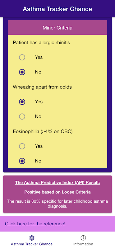 "دمہ ٹریکر کا امکان - دمہ کی پیش گوئی کا اشاریہ" ایک طبی موبائل ایپ ہے جو 3 سال سے کم عمر مریضوں میں بچپن میں دمہ پیدا کرنے کے امکان کو طے کرنے کے لئے ہیلتھ پریکٹیشنر یا اطفال سے متعلق ماہر کی مدد کے لئے ڈیزائن کیا گیا ہے۔ "دمہ ٹریکر کا امکان - دمہ کی پیش گوئی کا اشاریہ" ایپ سخت معیار اور ڈھیلا معیار دونوں پر مبنی ہے۔ دمہ کی پیش گوئی کرنے والے انڈیکس کے لئے سخت معیارات ہر سال 3 سے زیادہ گھرگیرے والے اقساط والے بچوں کے لئے استعمال ہوں گے۔ جبکہ ڈھیلے معیار ہر سال 3 سے کم گھر والے گھروں میں واقع ہونے والے اقساط والے بچوں کے لئے استعمال ہوں گے۔