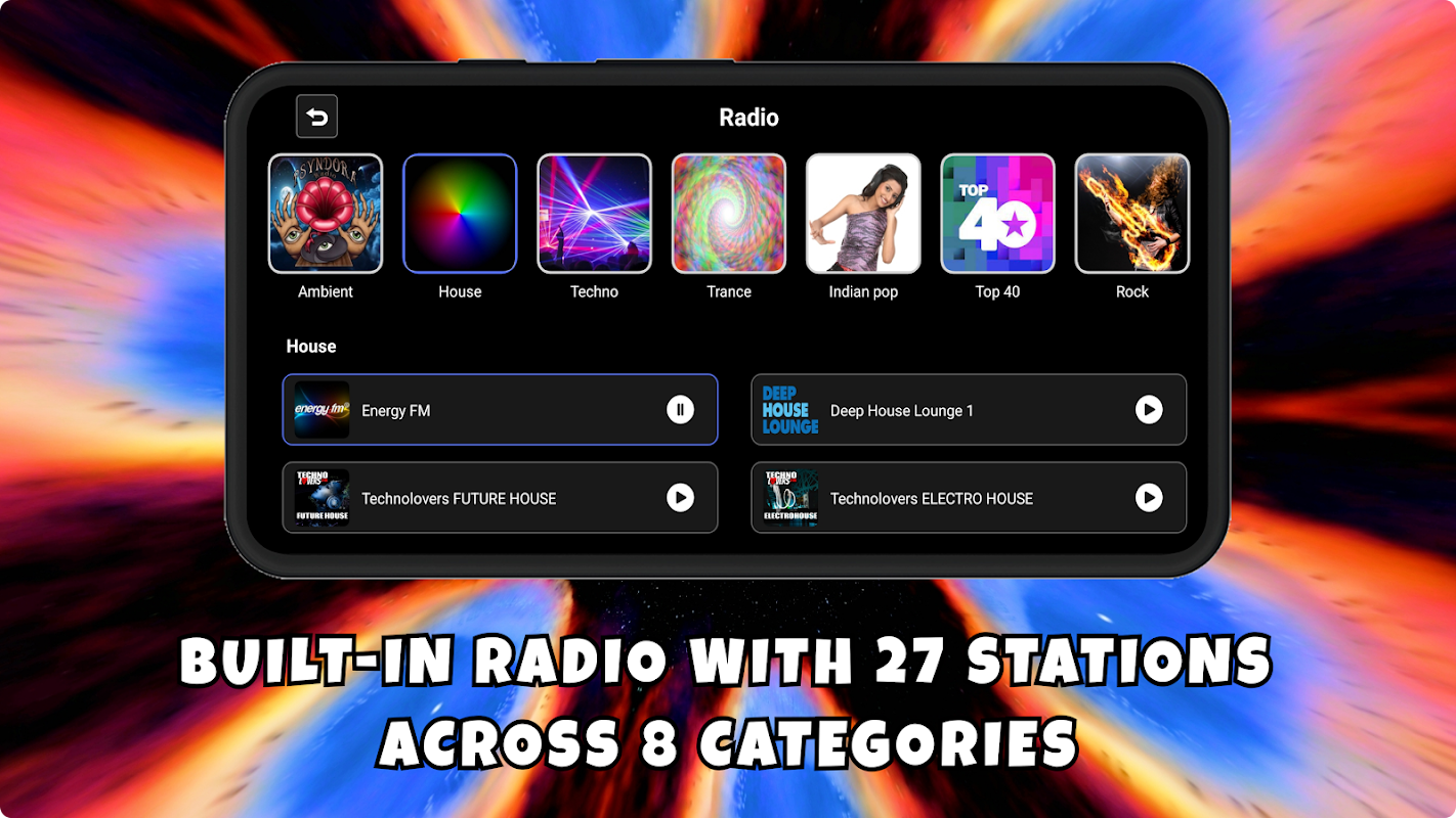 کسی بھی میوزک پلیئر ایپ کے ساتھ اپنی موسیقی چلائیں۔ پھر اس ایپ پر جائیں۔ اس کے بعد یہ موسیقی کا تصور کرے گا۔ ایپ میں موسیقی کی مختلف انواع میں متعدد آن لائن ریڈیو اسٹیشنوں تک رسائی شامل ہے۔ آپ کی میوزک فائلوں کے لیے ایک پلیئر بھی شامل ہے۔