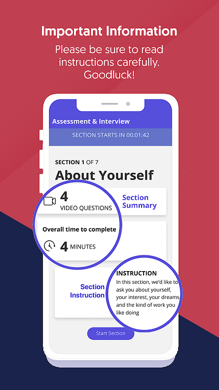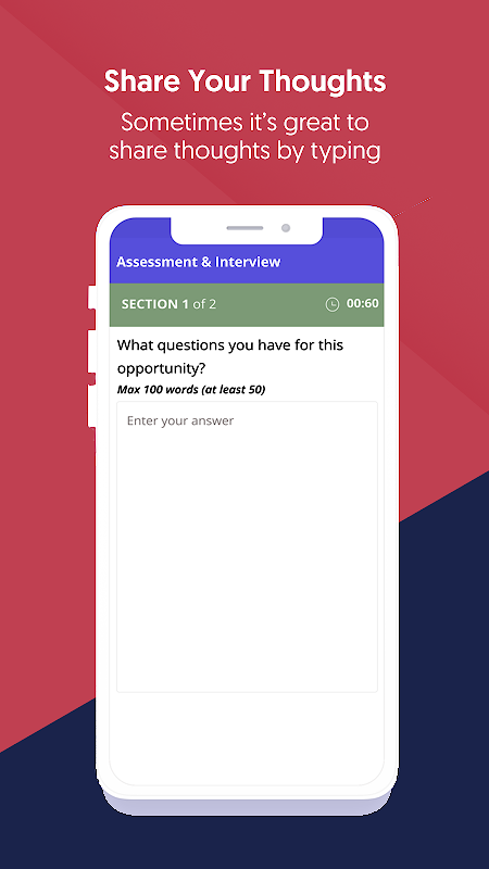 یہ کیسے کام کرتا ہے؟ ایپ انسٹال کرنے کے بعد، آپ کو لنک پر کلک کرنے یا کوڈ درج کرنے کی ضرورت ہے، جو کمپنی کی طرف سے آپ کے دعوت نامے میں ملتا ہے۔ اس کے بعد آپ کو انٹرویو کے سوالات ملیں گے جو کمپنی نے آپ کے لیے وضاحت کے ساتھ ڈیزائن کیے ہیں۔ آپ ایپ میں اپنے ویڈیو سیلفی جوابات ریکارڈ کر سکتے ہیں، ایک وقت میں ایک سوال۔ کمپنی "نو-ریکارڈنگ" کی خصوصیت استعمال کر سکتی ہے لہذا محتاط رہیں اور اپنے جوابات کے بارے میں احتیاط سے سوچیں۔ جوابات سختی سے خفیہ ہیں اور صرف کمپنی دیکھ سکتی ہے۔