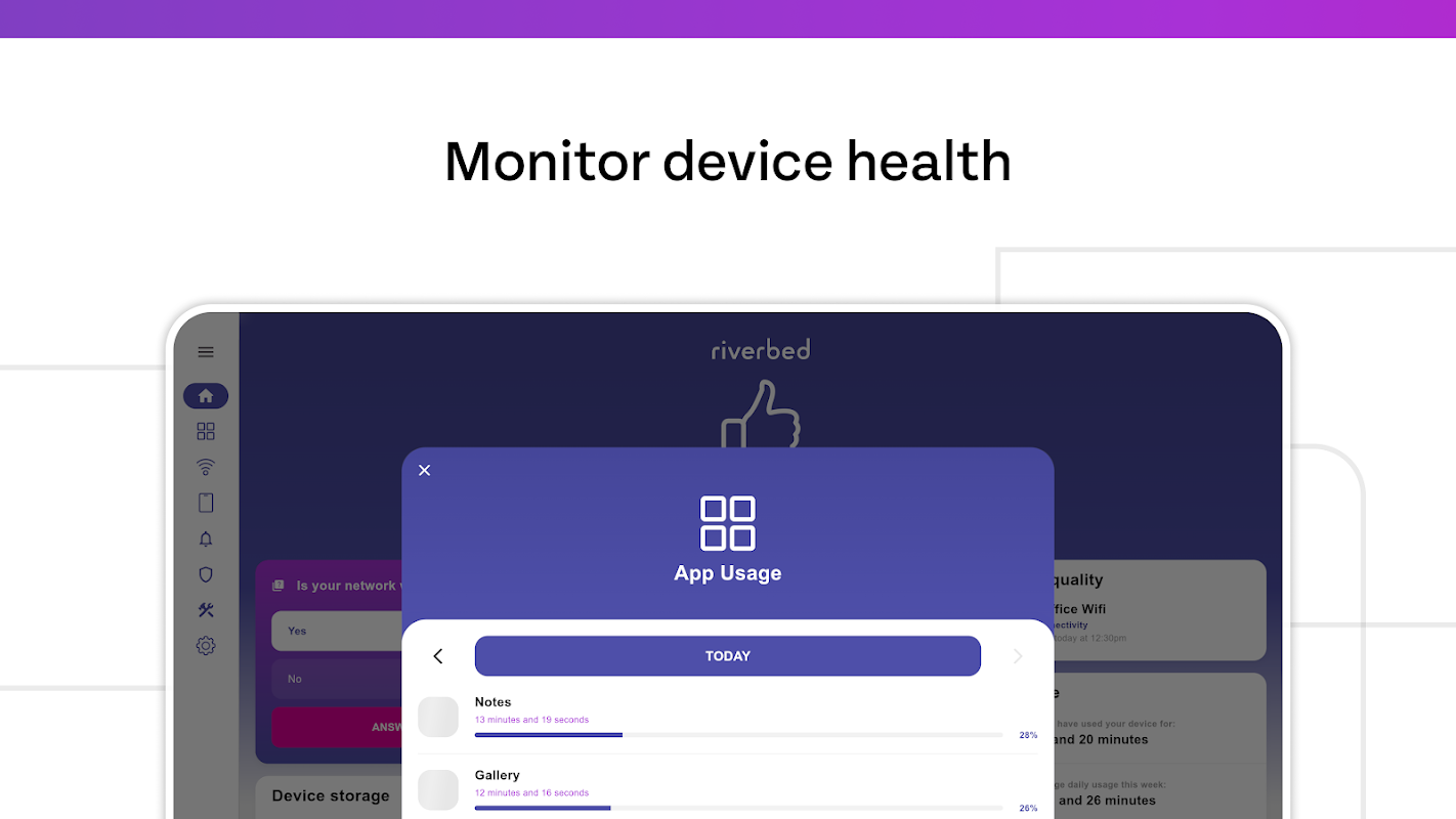 ملازم کی پیداوری کو یقینی بنانے کے لیے موبائل ایپ کی کارکردگی کی نگرانی کریں۔ Aternity Mobile افرادی قوت کے ذریعہ استعمال ہونے والی ہر کارپوریٹ موبائل ایپ کے استعمال اور کریشوں کی بھی نگرانی کرتا ہے۔ Aternity تفصیلی معلومات فراہم کرتا ہے جیسے کہ ہر ایپ کے ذریعے پیدا ہونے والی ٹریفک، ایپ کے شروع ہونے اور رکنے کا وقت، اور صارفین اپنے موبائل ڈیوائس کے ساتھ جن ڈومینز تک رسائی حاصل کر رہے تھے، اس بات کو یقینی بنانے کے لیے کہ موبائل ڈیوائس صرف کمپنی سے منظور شدہ ایپس کے لیے استعمال ہو رہی ہے۔ یہ آئی ٹی کو اس بارے میں گہری بصیرت فراہم کرتا ہے کہ موبائل ایپ کی کارکردگی اور استعمال کس طرح پیداوری اور سلامتی کو متاثر کرتا ہے۔