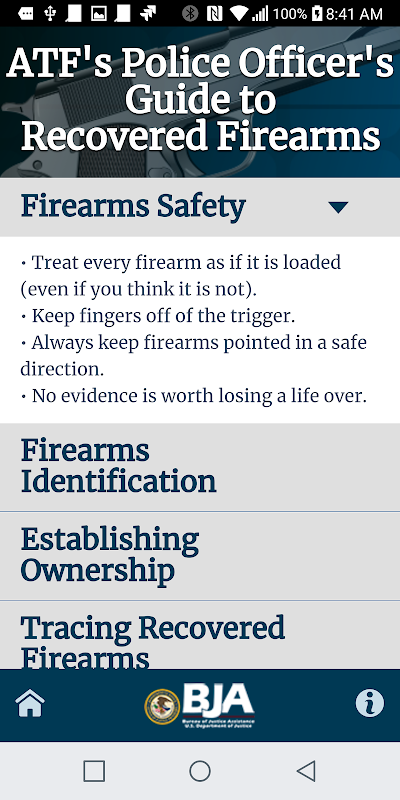 The ATF Police Officer's Guide to Recovered Firearms mobile application is designed to assist law enforcement in firearm identification, trace, recovery and safety. Utiizing the app, law enforcement officials will receive strategies to enhance firearm safety, a visual guide for accuracy in firearm identification and a collection of tips, policies and procedures to assist in firearms investigations. The ATF Firearms app is a helpful resource as Investigative priorities focus on targeting armed violent offenders and career criminals, narcotics traffickers, narco-terrorists, violent gangs, and domestic and international arms traffickers