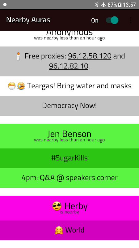 ◉ During street protests Aura allows to disperse messages even if the internet or phone network is disabled