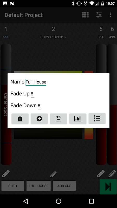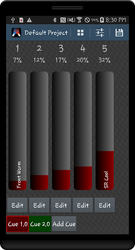 منصوبے کو محفوظ کریں چینلز کی موجودہ حالت ، پیچ اور صارف کے تفویض کردہ نام کی اشارے بچائیں گے۔ لوڈ پروجیکٹ پہلے محفوظ شدہ پروجیکٹ کو کھولے گا۔ منصوبے کے نام پر ایک لمبی دبائیں حذف کرنے کا اشارہ کرے گی۔ موجودہ پروجیکٹ کو باہر نکلنے یا سوئچ کرتے وقت پروجیکٹ محفوظ ہوجاتا ہے۔ موجودہ پروجیکٹ کا نام مرکزی صفحے کے اوپر دائیں طرف ظاہر ہوتا ہے۔