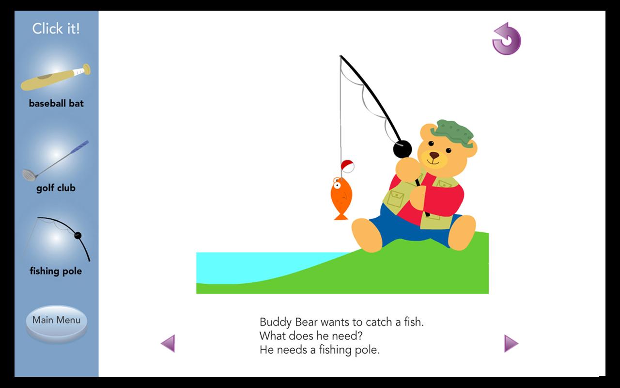 Children choose the correct answer with an easy one-click response. Back, forward, and repeat arrows provide easy screen navigation. The stories are fully narrated and a friendly “Good job!” reinforces correct responses.