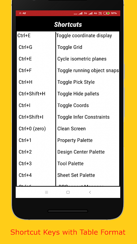 یہ ایپ ایک آف لائن صارف ایپلی کیشن ہے۔ آٹوکیڈ شارٹ کٹ چابیاں سیکھیں اور استعمال کریں جو آٹوکیڈ 2 ڈی اور تھری ڈی ڈرافٹنگ استعمال ہوتی ہیں۔ سول انجینئرنگ اور مکینیکل انجینئرنگ کے طلباء ، ڈرافٹس مین اور شارٹ کٹ کیز کے ساتھ انجینئرز کی مدد کے لیے ، ایک بہتر آئیڈیا ایپ میں لاگو کیا گیا ہے۔