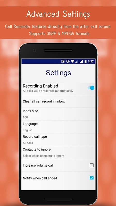 Auto Call Recorder is amazing and simple app, you can record incoming and outgoing calls. There is no need of doing paperwork like noting down phone numbers and addresses. No need of worrying about important calls. All the outgoing and incoming calls will be saved. You can play and listen to all calls any time from the inbox of our automatic call recorder. Each and every conversation of yours will be saved. This app is used as hidden call recorder as you can hide notifications. You can save useful call recordings and delete the unwanted. Manual and auto record option is available for your need.