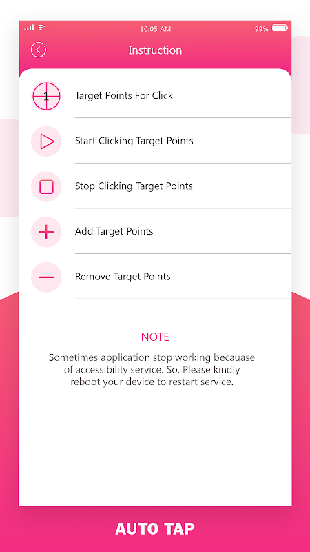Auto Clicker - Automatic Tapping - No Root app which has a Float point with it's easy to tap on any side in your mobile place, just tap on the start button and it will automatically provide users float point with that you can easily control your click.