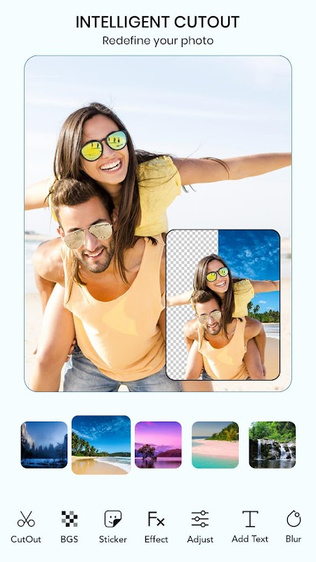 Best Auto Photo Cut Paste Lite to Cut out image, photo background editor / background changer of photo with HD quality natural background collections. You can also apply magical effects to photo by adjusting its brightness, contrast, saturation and other tools. You can also erase objects of the image or use brush to colour it. Don't like unwanted objects in your photo background? Do you want to change photo background? Then check our best features of background remover app cut out. This Auto Photo Cut Paste App is very easy and can change photo background to a beautiful background. Auto Photo Cut Paste Video where you want to cut a part of Photo or Extract a person from Photo Background.