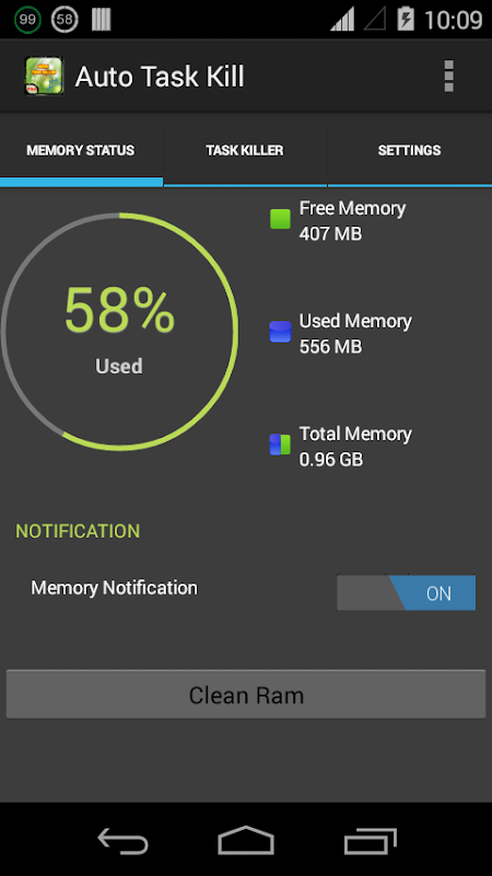 ►Ram Optimizer: Current Ram Usage shows how fast is system runs. Auto Task Killer shows real time ram usage.