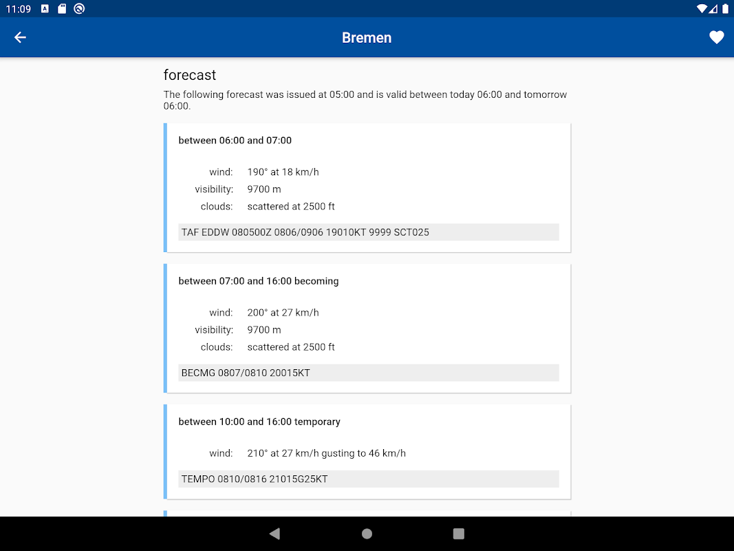 ہوا بازی کا موسم ایپ مقامی اور عالمی ہوا بازی کی موسم کی اطلاعات کو قابل اعتماد اور جلدی سے طلب کیا جاسکتا ہے۔ میٹار اور ٹی اے ایف کے پیغامات کو ضابطے کی شکل میں دکھایا گیا ہے۔ انفرادی اسٹیشنوں کو پسندیدہ فہرست میں محفوظ کیا جاسکتا ہے۔ تمام یونٹ کی ترتیبات میں قابل ترتیب ہیں اور آپ کو اپنی ضروریات کے مطابق ڈھال لیا جاسکتا ہے۔