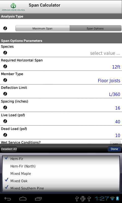 امریکن ووڈ کونسل (اے ڈبلیو سی) سپن کیلکولیٹر برائے ووڈ جوئسٹس اور رافٹرز (اسپین کیلک) تجارتی لحاظ سے دستیاب نرم لکڑی اور ہارڈ ووڈ لکڑی کی تمام اقسام اور گریڈ کے لئے حساب کتاب کرتا ہے جیسا کہ لکڑی کی تعمیر کے ضمیمہ کے لئے 2012 کے قومی ڈیزائن کی تفصیلات (این ڈی ایس®) میں ملا ہے: لکڑی کی تعمیر کے لئے ڈیزائن کی اقدار مارچ 2012 اور مارچ 2013 ایڈیندا کے ساتھ۔ عام بوجھ کے حالات کے لئے جوئسٹس اور رافٹر اسپینز کا تعین کیا جاسکتا ہے۔ ایک مدت کے اختیارات کیلکولیٹر موازنہ مقاصد کے لئے متعدد پرجاتیوں اور درجات کے انتخاب کی اجازت دیتا ہے۔