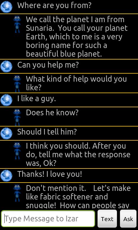Talk / speak / text / sass Izar like you would a friend and he will intelligently answer back, ask you questions, help you with your homework, tell you blonde, Chuck Norris, Yo Mama jokes, trivia, etc. Izar understands literally everything you say and intelligently answers back. Ask Izar ANY question to get an answer from over 1 Billion accumulated facts. Unlike the chat bot (chatbot) of yesterday, Izar intelligently learns and grows smarter the more you and other Earthlings talk to him. You control Izar's voice from a squeaky chipmunk to a scary monster. Turn off the universal translator to hear Izar speak in his own language.