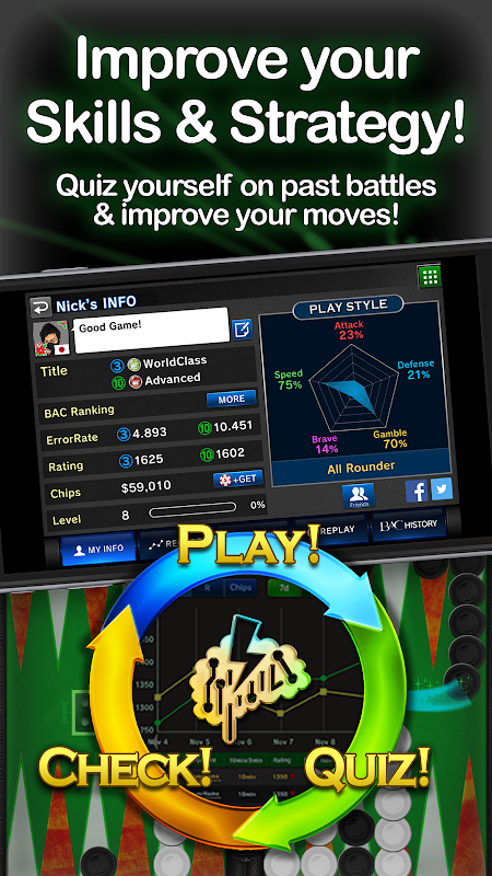 • View backgammon win rates on an intuitive graph, and keep coming back to watch your game improve