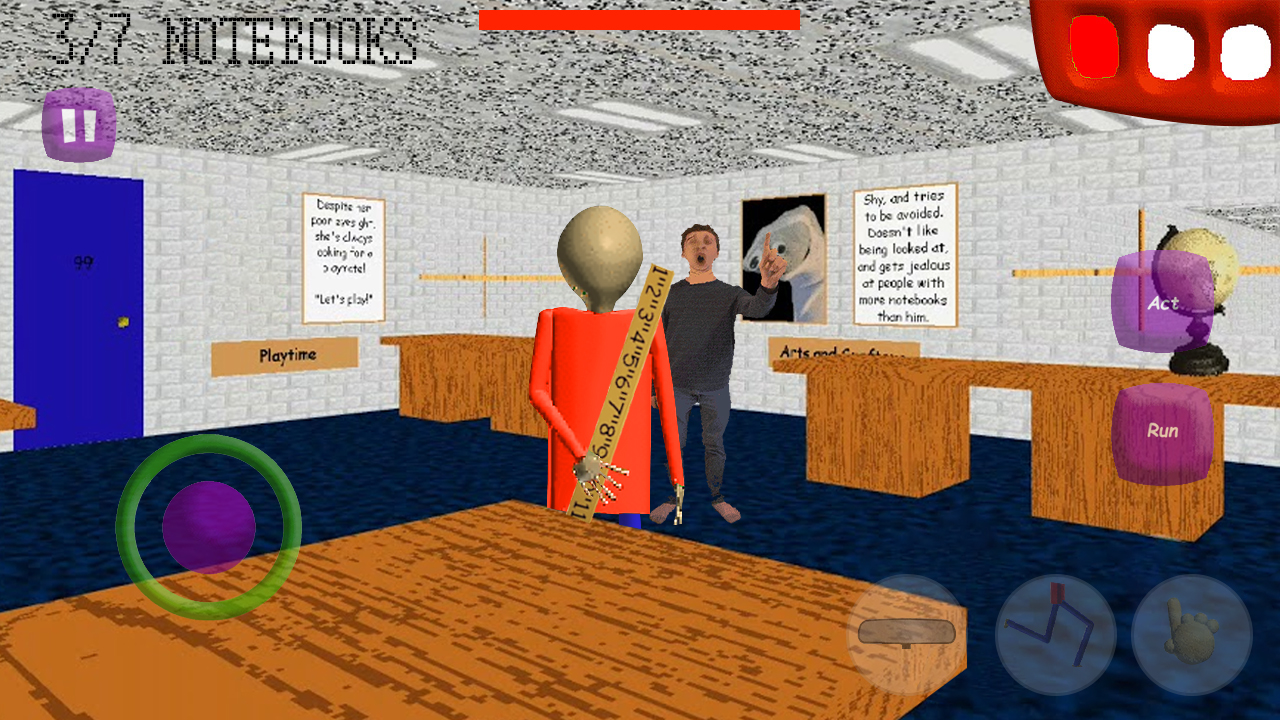 -Story mode requires you to collect 7 notebooks and then escape the school to win. The more notebooks you collect, the faster Baldi will become! Simple, but very challenging.-Endless mode is a challenge to see how many notebooks you can collect before being caught by Baldi. Over time Baldi will speed up, but each time you successfully solve the problems in a notebook he'll slow down. The longer you can keep his speed down, the more notebooks you can collect!