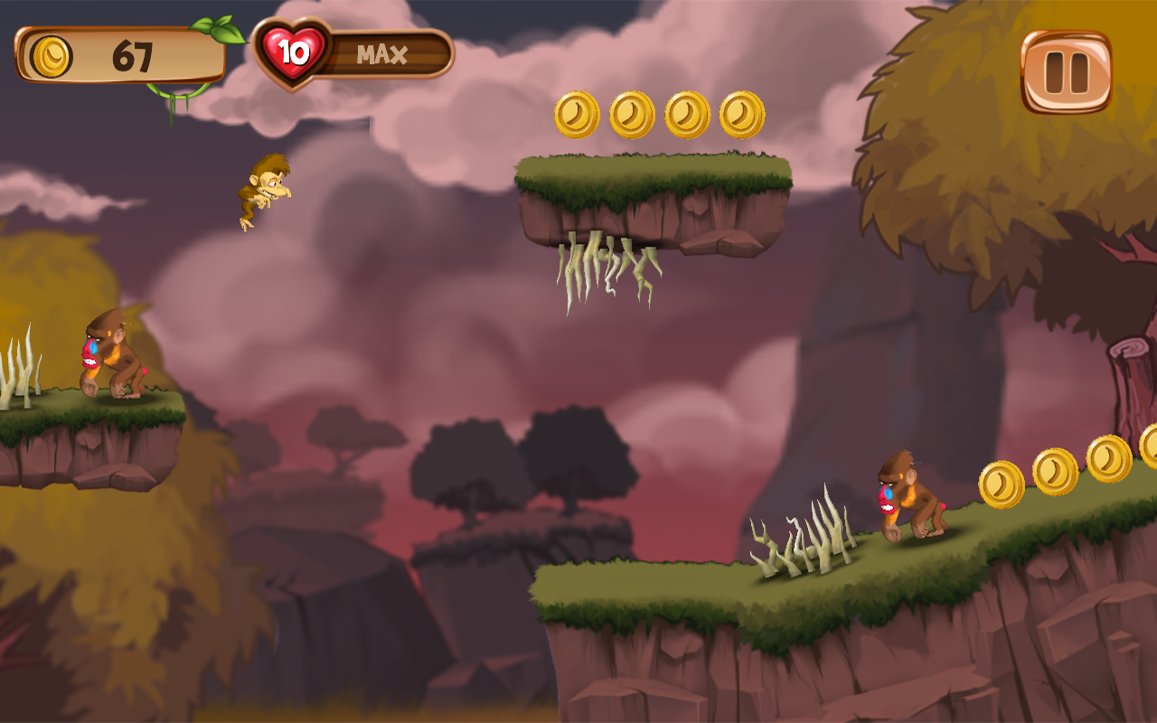 You're tired of grannies, zombies, and temple races, right? It's time for innovation! This jungle monkey runner is always racing forward, and your job is to jump and avoid obstacles, battle your enemies, and collect coins. So, let's kick off this crazy “monkey run” adventure quest together! We guarantee you that this awesome 2d side scroller running game will give you an awesome bounty ride!