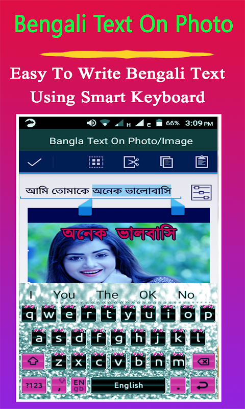 You can Write Bangla Shayari, Your Name on photo in Bangla, Bangla Poetry, Bangla Suvichar, Bangla Gazal, Bangla Jokes, Bangla Poem and Messages easily with the help of Bangla keyboard on your selected photo from gallery or camera.