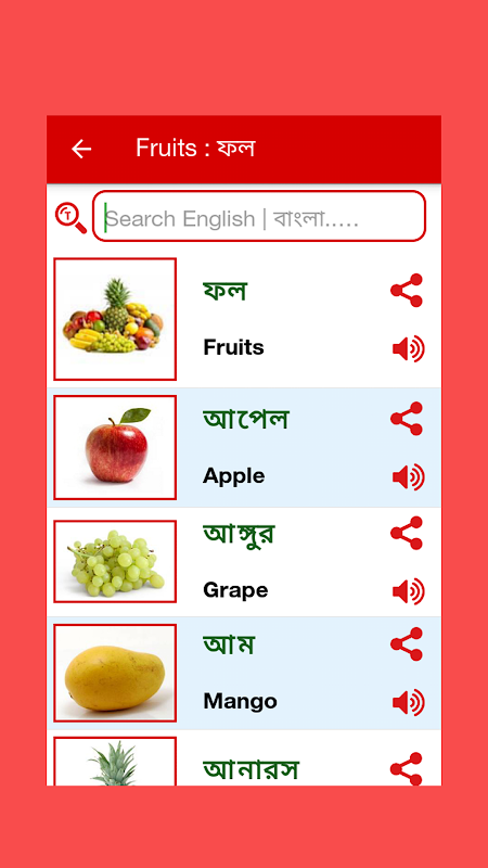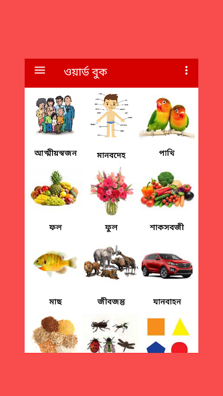 تصاویر کے ساتھ بنگلہ سے انگریزی اور انگریزی سے بنگلہ آف لائن ورڈ بک ایپ۔ تصویر اور سائنسی نام کے ساتھ الفاظ کے معنی۔ بنگلہ اہم جملہ۔ عام طور پر استعمال شدہ فعل اور الفاظ۔ الفاظ کا تلفظ۔ انٹرنیٹ کنکشن کی ضرورت نہیں ہے۔