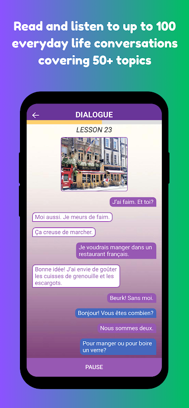 ہمارے انگریزی، فرانسیسی، ہسپانوی اور جرمن زبان کے ورژنز کے لیے، 50+ موضوعات پر مشتمل 100 روزمرہ کی زندگی کی گفتگو کو پڑھیں اور سنیں! صارفین کو ان چار زبانوں میں سے کسی سے بھی مکالمہ سنتے ہوئے فوری طور پر اپنے انگریزی، فرانسیسی، ہسپانوی یا جرمن ترجمے تک رسائی حاصل کرنے کی اہلیت ہوگی۔ اگر آڈیو میں ایسے الفاظ ہیں جو آپ کے لیے ناواقف ہیں، تو آپ ان کے ترجمے کو صرف ایک کلک سے آسانی سے ظاہر کر سکتے ہیں! آپ ڈائیلاگ کو دوبارہ چلا سکتے ہیں اور جتنی بار ضرورت ہو اس کے ترجمے پر کلک کر سکتے ہیں۔ صارفین ان چار زبانوں میں سے ہر ایک سے 4,500 سے زیادہ ضروری الفاظ اور فقرے (بشمول بول چال کے تاثرات) مختلف انٹرایکٹو مشقوں کے ذریعے حاصل کر سکتے ہیں – بشمول اعلیٰ معیار کی AI ویڈیو مشقیں!