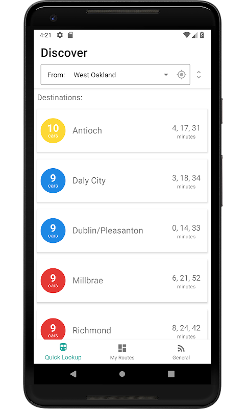 Bart Better can be used to track real-time schedule for BART (Bay Area Rapid Transit) system. You can use "Quick Lookup" to get basic info, adding your favorite routes to "My Routes", and check all the real-time departure time, delay status, fare calculator there. You can find all-routes BART map from "General" and contact us if any problems there too.