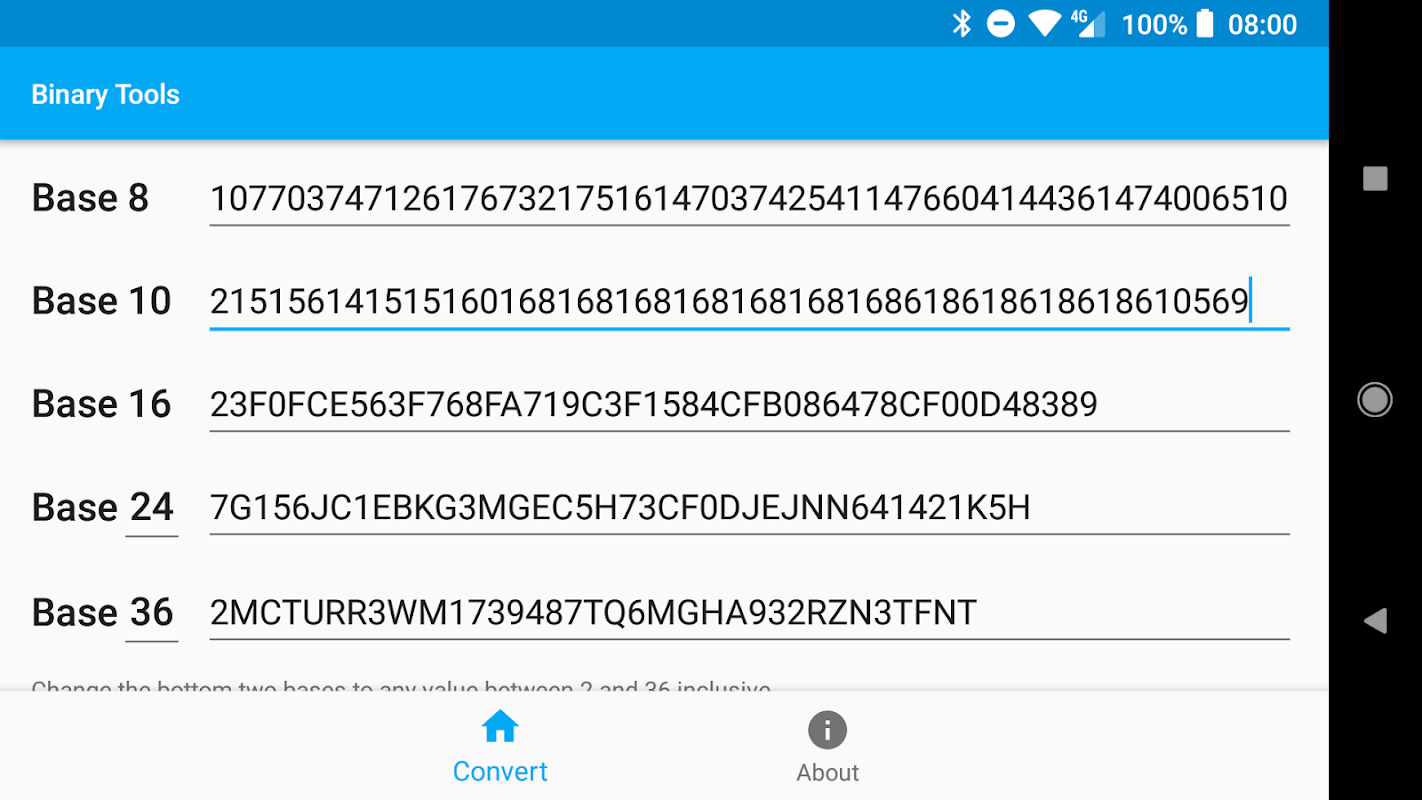 Binary Tools is a small app that can convert numbers from any base between 2 and 36.
