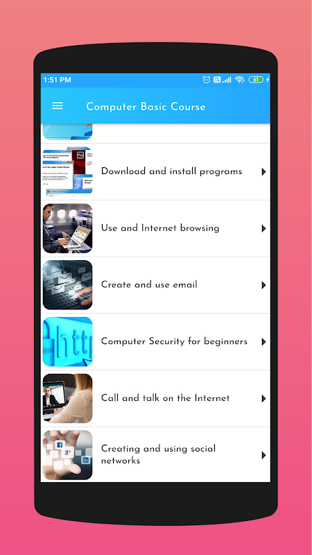 Basic Computer Knowledge Free application, you learn basic elements to use the computer, as well as the basic knowledge to navigate the Internet, use email, social networks and understand basic concepts of computer.