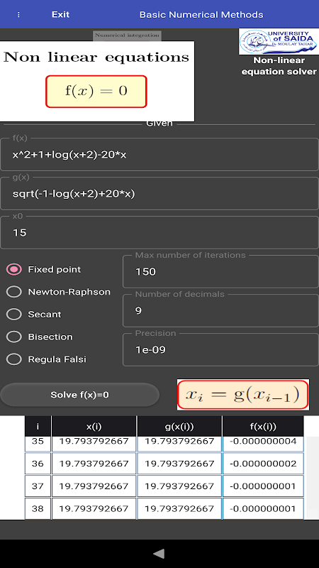 - نان لائنر مساوات کی جڑوں کی گنتی کریں (بریکٹنگ کے طریقے (بائیسیکشن، ریگولا-فالسی) اور اوپن میتھڈز (نیوٹن-ریفسن، فکسڈ پوائنٹ اور سیکنٹ)؛