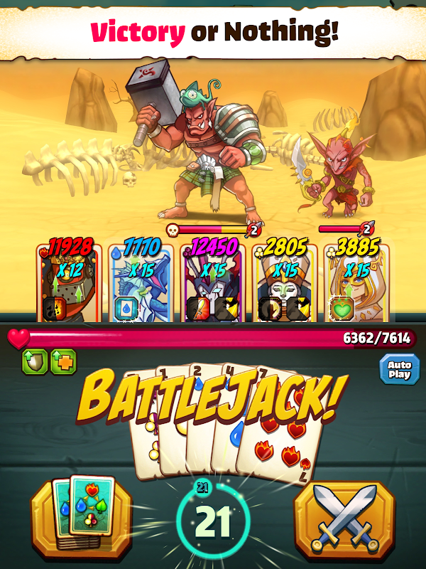 Collect hundreds of legendary heroes and engage in high risk, high reward card battle games in Battlejack, the only fantasy RPG game with a unique blackjack-inspired card battle system!