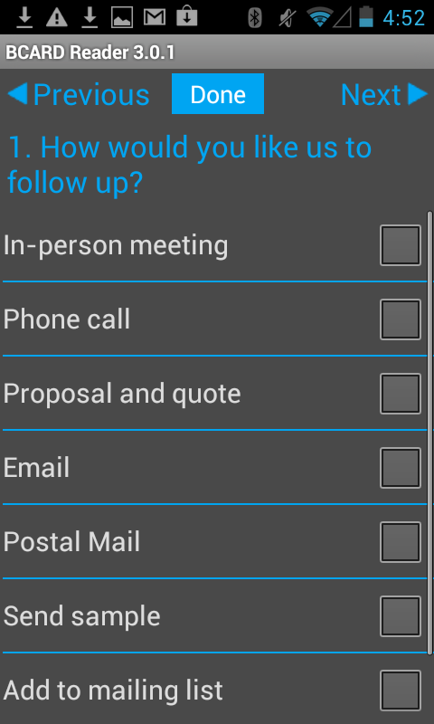 The trade-show and conference BCARD badge reading application, that allows you to capture and manage lead data on an Android phone or Tablet. BCARD's are contact-less 'touch-and-go' smart cards used at many trade shows to easily share contact data with colleagues and businesses. An NFC chip is required to read BCARD's and is available on many Android devices such as the Nexus S, Nexus 7, Galaxy Nexus, HTC One X, Sony Xperia S, Galaxy S3 and many others. Onsite rental of NFC capable Android devices is usually available, just look for the 'Lead-Retrieval' desk at the exhibition.