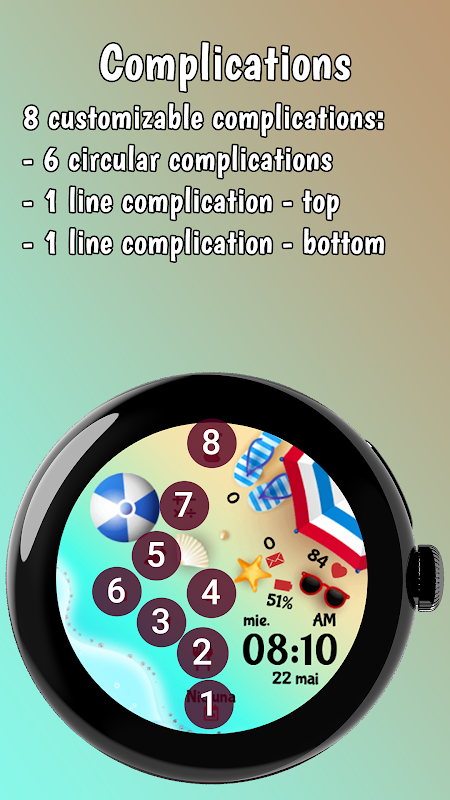 Wear OS کے لیے ڈیزائن کیا گیا حتمی اینیمیٹڈ واچ فیس، بیچ ویوز کے ساتھ اپنی سمارٹ واچ کو ایک پرسکون ساحل سے فرار میں تبدیل کریں۔ سکون کو محسوس کریں جب نرم لہریں ساحل کی طرف لپکتی ہیں، بغیر کسی رکاوٹ کے وقت کو ڈھانپتی ہیں، اور ساحل کی گیند کو ہر ایک پھول کے ساتھ کھلے دل سے بوب کرتے دیکھیں۔