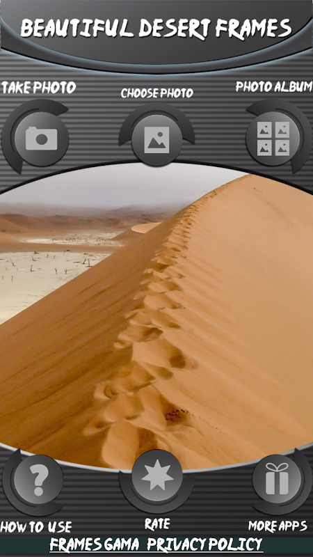 Are you fascinated with this wonderful planet of ours? It hides so many wonders and we can never get enough of its beauties. Our new application was inspired by deserts and it will take you to the hottest places on Earth where you can enjoy beauties of golden dunes that shine underneath the sunshine. This top photo editor offers something different than what you got used on seeing and it will leave you breathless when you see how magnificent the desserts are. All you have to do to get closer to them and use them as decoration for your photographs is to download free ☎Beautiful Desert Frames☎ app, so hurry up and press that install button ASAP!